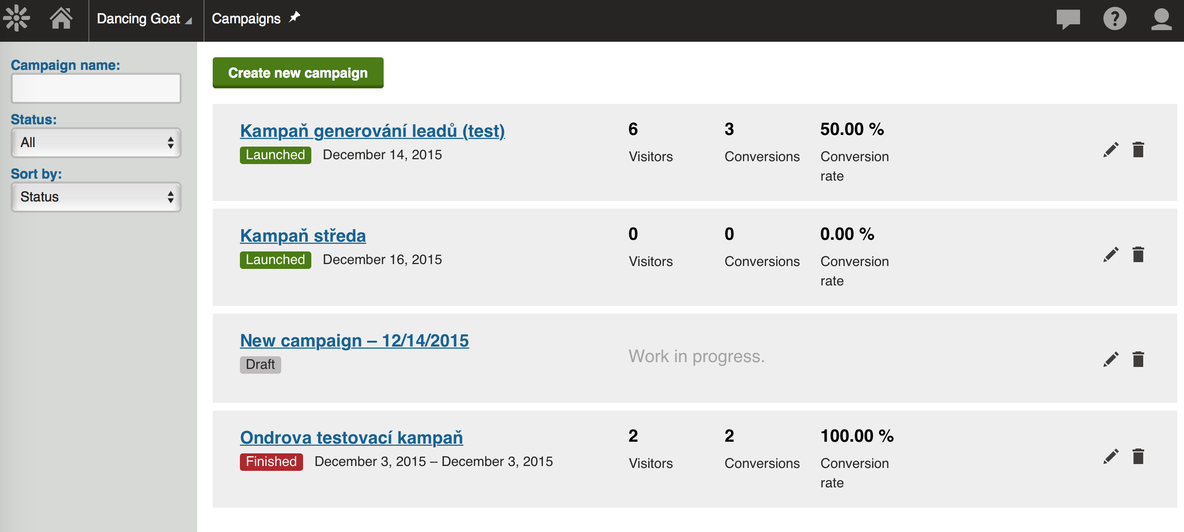 - možnost připínat na Dashboard konkrétní prvek (např. konkrétní kampaň, či formulář, nikoliv jen sekci kampaně, či formuláře)