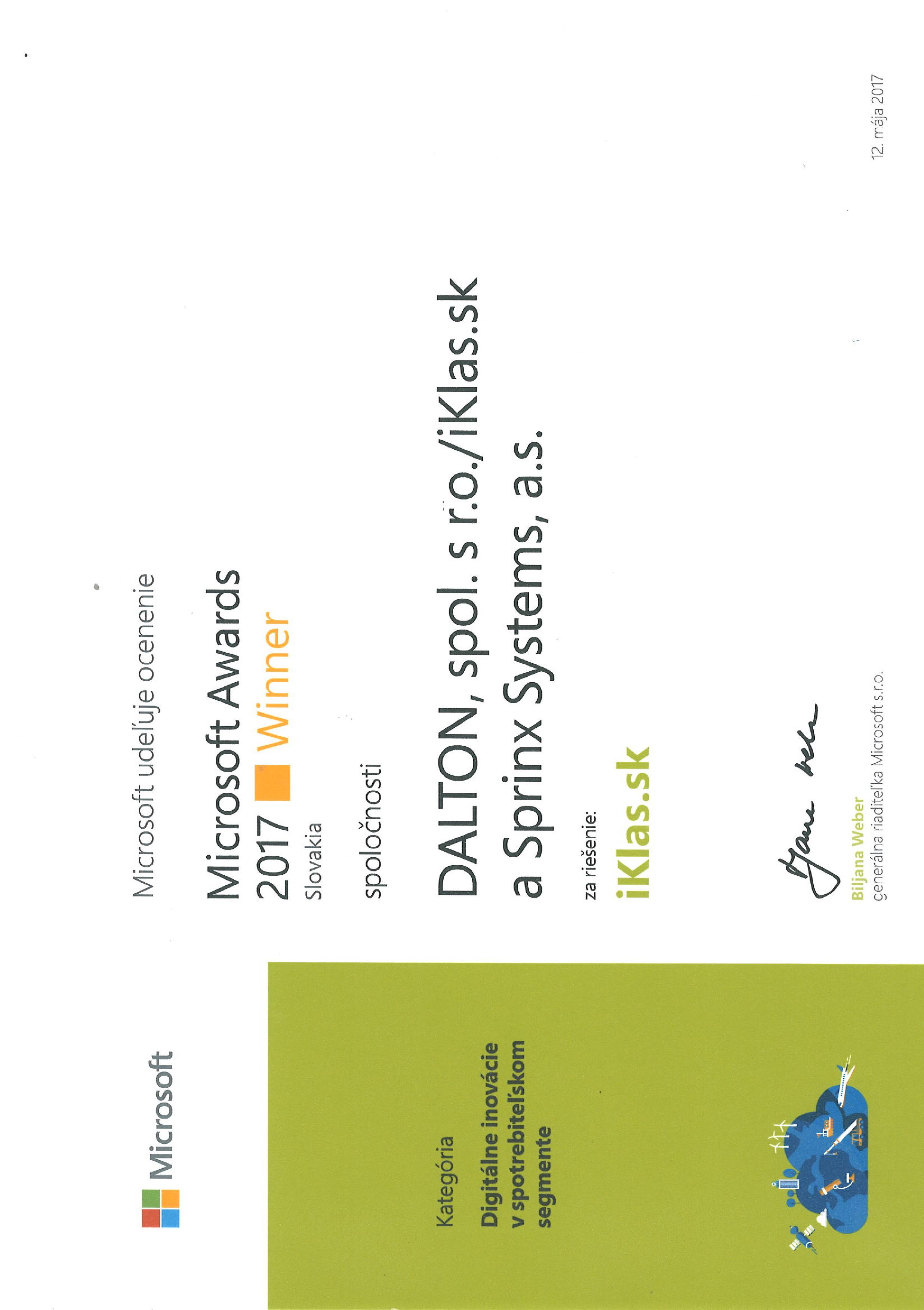 Sprinx Systems uspěl ve velké konkurenci a získal ocenění Microsoft Awards v kategorii digitálních inovací ve spotřebitelském segmentu. Posuzovaným projektem se stalo řešení pro firmu Klas, která je známám kameným prodejcem potravin na Slovenku a které Sprinx pomohl s přechodem do digitální ekonomiky pomocí tvorby eshopu pro nákup potravin www.iklas.sk